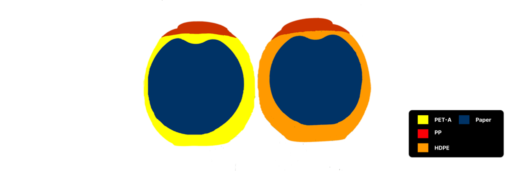 As seen below, the same container is made with either PET or HDPE. Furthermore, the caps are made from a different material altogether, PP, whereas the labels are made of paper. These subtleties would all be missed by conventional computer vision-based sorting systems, and would result in the introduction of significant contamination.