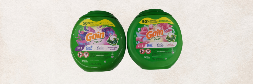 Identical detergent containers found at a local grocery store.