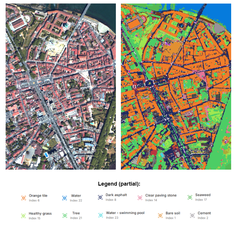 Figure 2: Toulouse’s Saint-Cyprien neighborhood seen in False RGB color (left) and as a pixel-wise land cover classification map obtained from the CNN (right). Only a partial legend of the main classes is provided below and we refer the reader to the Clarity sandbox for an exhaustive legend.