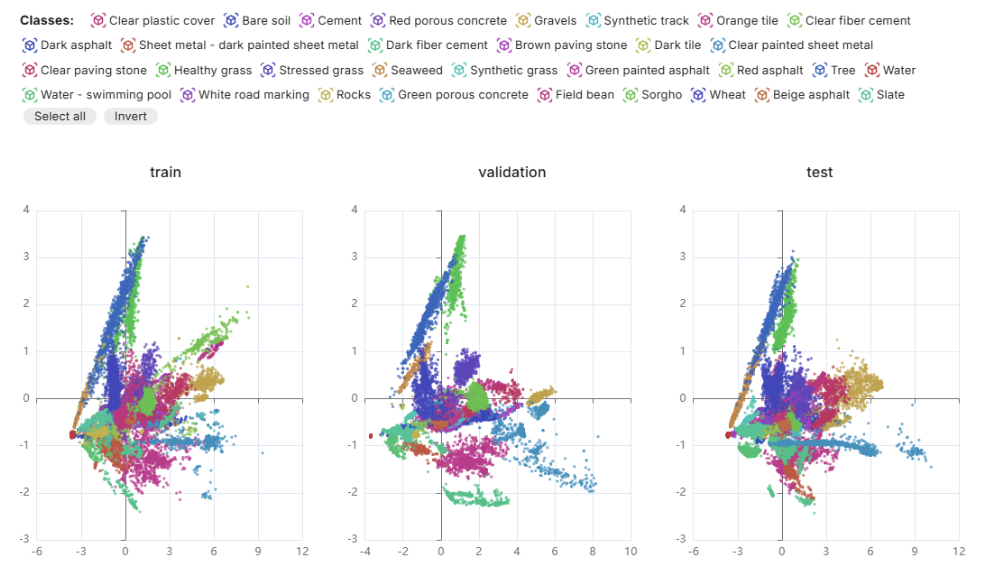 These splits can be reproduced with the code provided on the TlseHypDataSet GitHub repository. Each split was uploaded on Metaspectral’s Clarity platform to create a corresponding Dataset. Clarity gives an overview of the Dataset through the first and second PCA components (Figure 1) for the train, validation and test subsets. The dataset for split #5 can be visualized on the Clarity sandbox here.